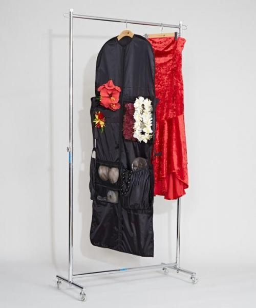 ドレスを最大5着運べるダンサーのマストアイテムです。内側にヘアクリップを付けられるバンドが2本、大小のメッシュポケット、大きめ袋ポケット、ハンガーの通し穴もついた機能性の高いバッグです。